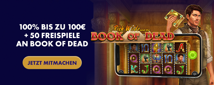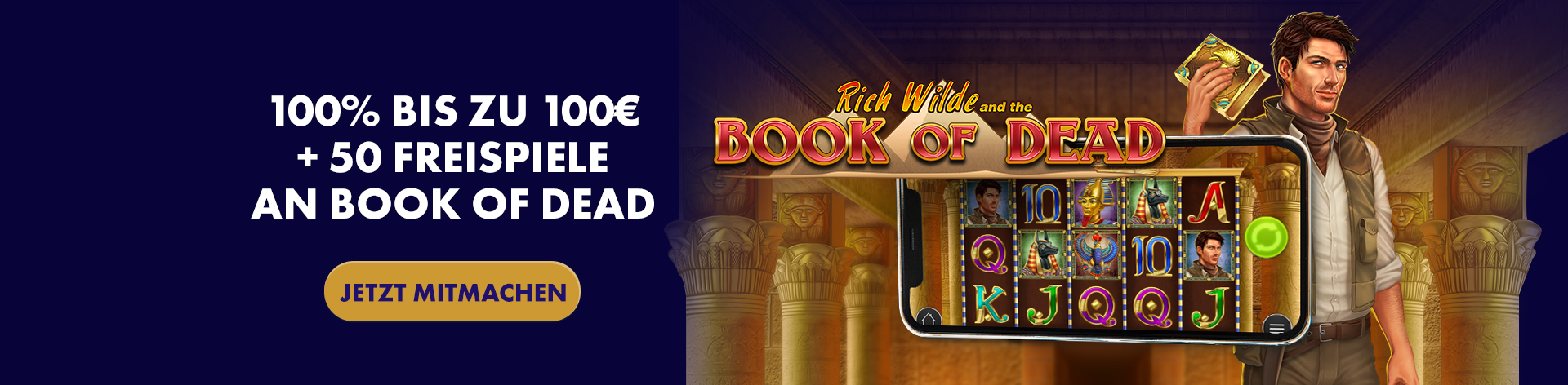 Wird bei der Einzahlung automatisch gutgeschrieben. Stornierung kann angefordert werden. Nur die erste Einzahlung. Max. Bonus 100€. Die maximale Anzahl an Freispielen ist 50. Spiel: Book of Dead, Spielwert: 0.10€. Einsatzanforderung: Innerhalb von 30 Tagen 30 Mal den Einzahlungs- und Bonusbetrag und 60 Mal den Freispiel-Gewinnbetrag setzen (nur Spielautomaten zählen). Der maximale Einsatz sind 10 % (min. 0.10€) des Freispiel-Gewinnbetrags und Bonusbetrags oder 5€ (geringster Betrag gilt). Die Spiele müssen verwendet bzw. der Bonus in Anspruch genommen werden, bevor das eingezahlte Guthaben genutzt wird. Es gelten die Bonusrichtlinien.